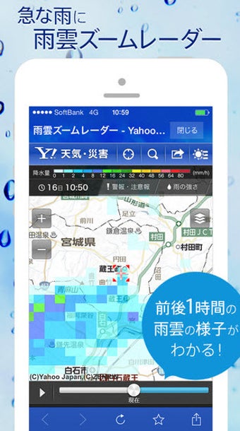 天気を見たい場所を5ヶ所まで登録でき、画面上の矢印ボタン一つ又はスワイプ一つですぐにチェックできます。このほかにも、台風や地震、津波情報、警報・注意報などの災害情報をお知らせしたり、雨雲ズームレーダーで雨が降っている場所を確認できたりします。